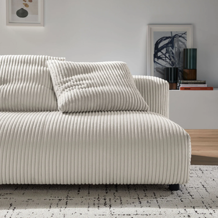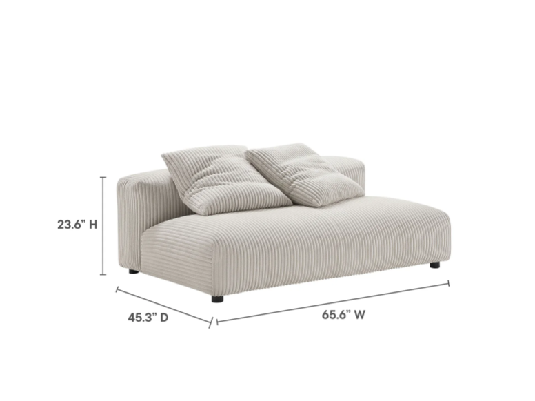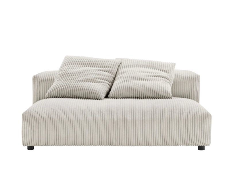 Revel in ultimate comfort and modern style with the Solace Modular Corduroy Loveseat. This oversized corduroy fabric loveseat is perfect for any living room, offering endless flexibility. Its modular furniture design allows you to change the arrangement to suit the needs of the moment or expand your seating by adding more pieces in the future. Featuring a sturdy frame, dense foam padding, and a sinuous spring support system, the Solace Armless Loveseat grants a premium seating experience. The comfy corduroy upholstery adds a cozy, casual vibe, making this modular loveseat a perfect addition to any living space or lounge area. Equipped with non-marking plastic glides and complementing accent pillows, this corduroy modern loveseat sofa couch is both stylish and practical. With easy assembly required, you can enjoy immediate relaxation on this upholstered loveseat. Weight Capacity: 800 lbs.
